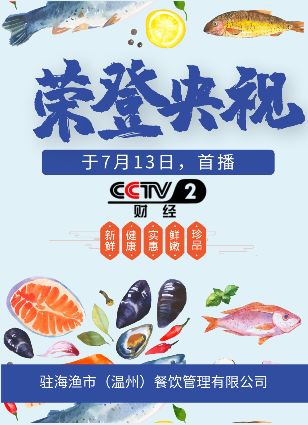 驻海渔市(温州)餐饮管理有限公司,品牌广告于2023年7月荣登CCTV-2财经频道,进行品牌展播,敬请期待!