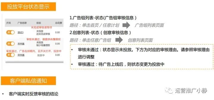 3.广告审核广告审核通过后(且开启状态下)即可在指定的广告上线时间上线。若审核被拒,通过以下2种方式提供结论