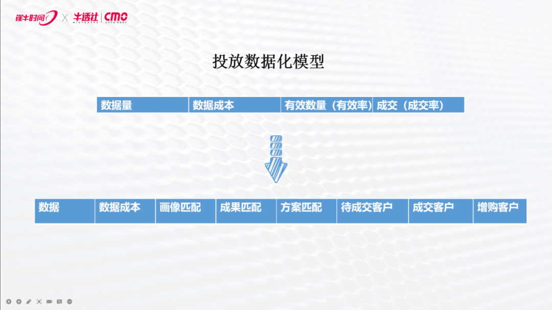 因此数据搭建、数据精细化运营和市场数据化至关重要最开始,我们关注的数据有数据量、数据成本、有效数量、成交率在客户画像上,市场部门的职责是获得足够多的数据量来符合 MQL 标准,看重有效率而非成交率后面按照销售里程碑的数据化模型统计,当每个阶段都呈现出来后找到问题进而优化。