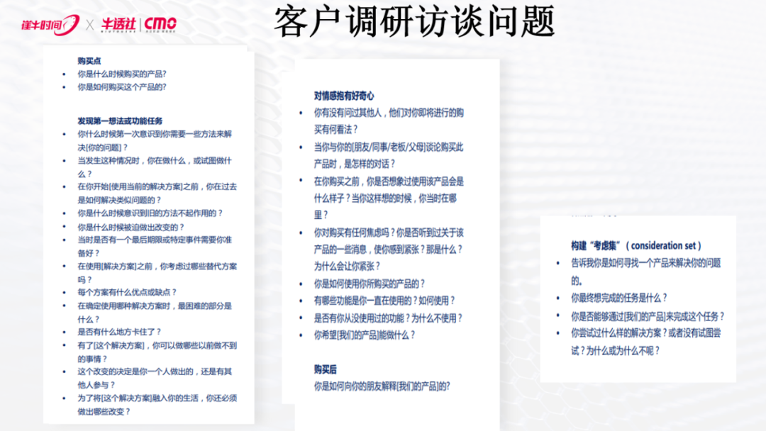 2. 动机被访谈者想使用新的方法来完成这个任务如用户希望建立一个获取线索的销售漏斗,使线索生成的过程自动化3. 驱动力它是导致用户寻求新的解决方案而不再按照原来的方式进行工作的情感力量如用户现在很沮丧,因为在过去几个月里没有达到线索获取目标。