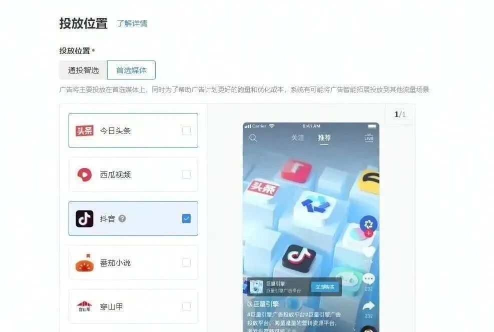 3.根据不同的营销目标和广告形式,设置不同的广告类型和广告目标,例如视频广告、橱窗广告、品牌活动等。把我们的落地页和视频搭配在一起创建广告,选择投放哪个媒体比如只投抖音,也可以多平台多选。