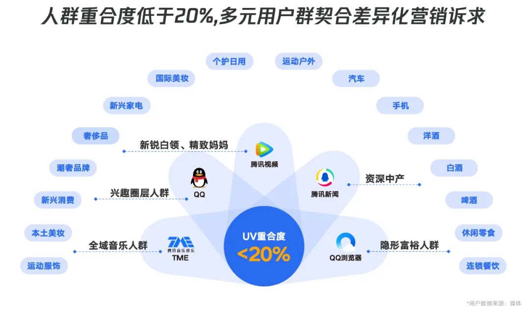 一个值得注意的数据是,腾讯旗下QQ、腾讯音乐、腾讯视频、腾讯新闻及QQ浏览器等不同场景的人群重合度低于20%。多元场景对应着截然不同的受众人群,企业的差异化营销诉求由此能够得到满足。