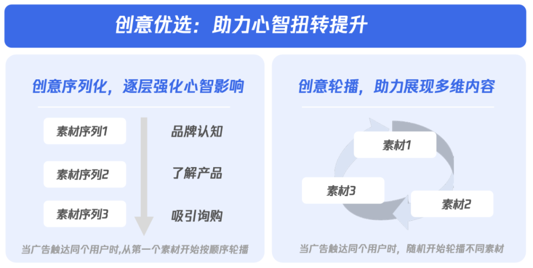 而在样式之外,小语境的创新还体现在其他更细节的层面比如广告在触达消费者时,商家可能希望沿着「明星代言-产品种草-销售转化」的节奏按先后次序分发素材针对这一点,腾讯广告提供了「创意序列化」的功能,确保品牌广告在腾讯生态内能够按要求依次触达,步步为营推动转化产生;另外,品牌商家可能会储备多条素材希望从不同层面刺激目标用户,那么「创意轮播」就能够避免受众被同一素材反复触达的尴尬。