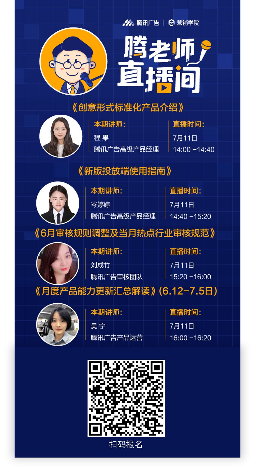 敬请访问e.qq.com,了解全新升级的腾讯广告投放管理平台为了让大家快速上手新版投放端,腾讯广告营销学院将在7月11日(明天)进行“腾老师直播间”的活动,欢迎大家扫码二维码或点击“阅读原文”报名参与,也可在文章底部留下您想和产品同学交流的问题哦!。