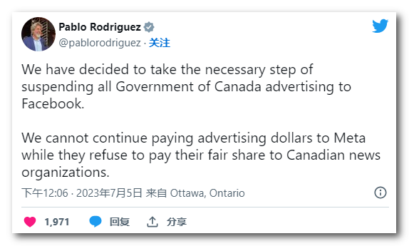 周三(7月5日)加拿大政府进行了反击:将停止在 Meta 的 Facebook 和 Instagram 上发布所有广告,这是首次直接回应大型科技平台的威胁。