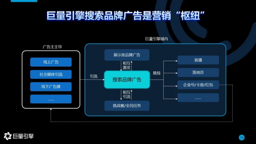 所以,作为“枢纽”的搜索品牌广告,不仅能承接平台本身用户边看边搜的需求,还能承接品牌线上线下多个渠道营销带来的搜索需求因此,借助巨量引擎搜索品牌广告,品牌既能承接住平台和其他渠道带来的流量,将其作为一个流量入口,还能与平台内的广告和UGC板块相互激发,并且能为直播、落地页、企业号等场景的转化进行引流。