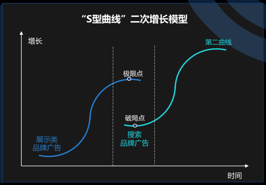 品牌持续性、广撒网式的投放,会吸引来庞大流量,但这一流量增长总会到顶继而下落比起流量流失后品牌再用广告重新触达,发挥承接流量作用的搜索品牌广告,必然得提前做好准备这一逻辑,其实与用于企业整体发展战略的第二曲线相同。