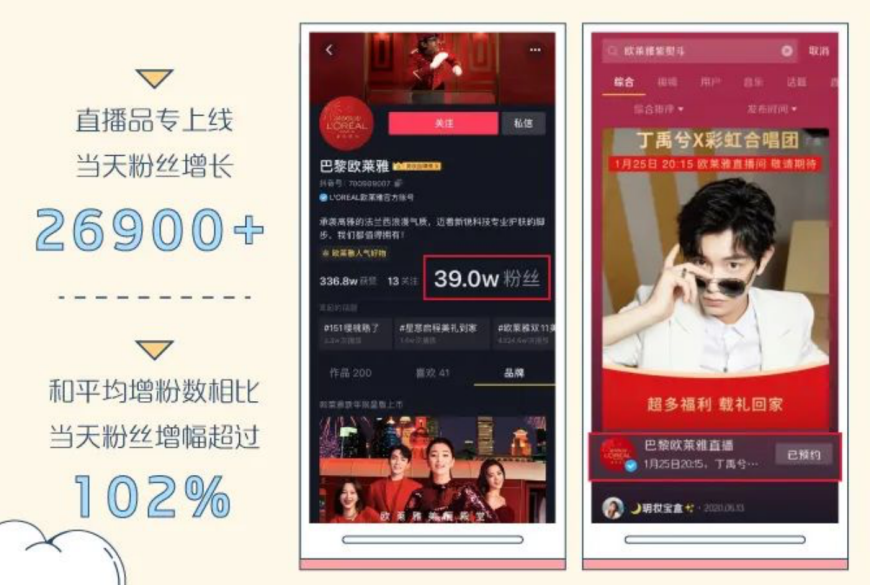 据官方数据,在直播品牌专区上线的当天,欧莱雅就收获了2.69万新增粉丝,其直播当天粉丝增幅也达到了102%,同时品牌词的搜索量也超过了平时的一倍以上