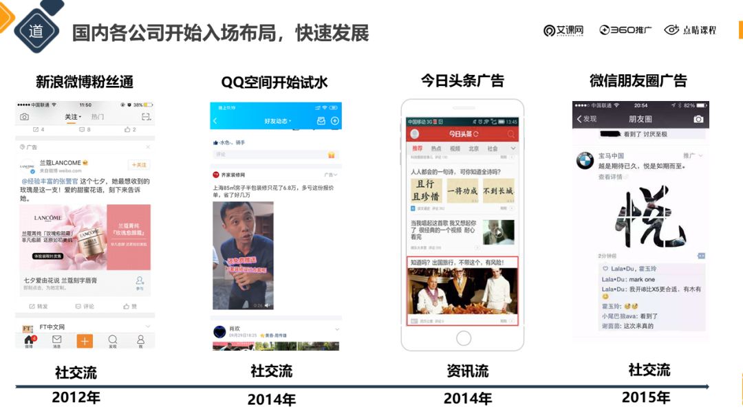 课程主要由三部分构成:第一,信息流广告发展之道;第二,信息流行业变化之势;第三,信息流未来破局之术01. 信息流广告发展之道:起源、诞生、萌芽广告离不开媒介,同样的,信息流广告也需要feed流式的环境,来做到广告的原生化。