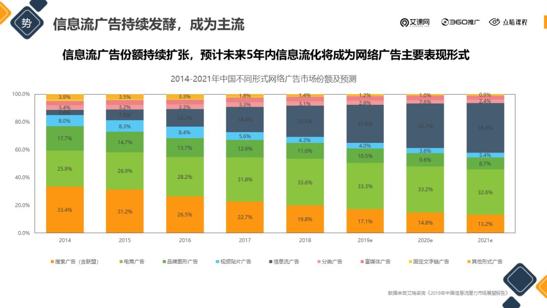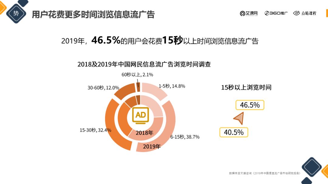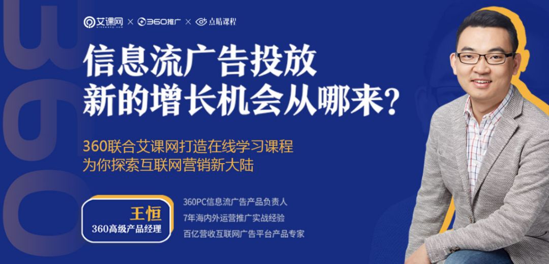 ①进入艾课网360点睛课程,搜索王恒老师《信息流广告行业趋势及蓝海市场研究》,观看回放;②文尾点击“阅读原文”即可直达课程回放;持续关注360点睛课程与艾奇在线打造的系列课程,下一期内容《视频化广告的特征与投放策略》,将在11月14日晚8:00准时直播