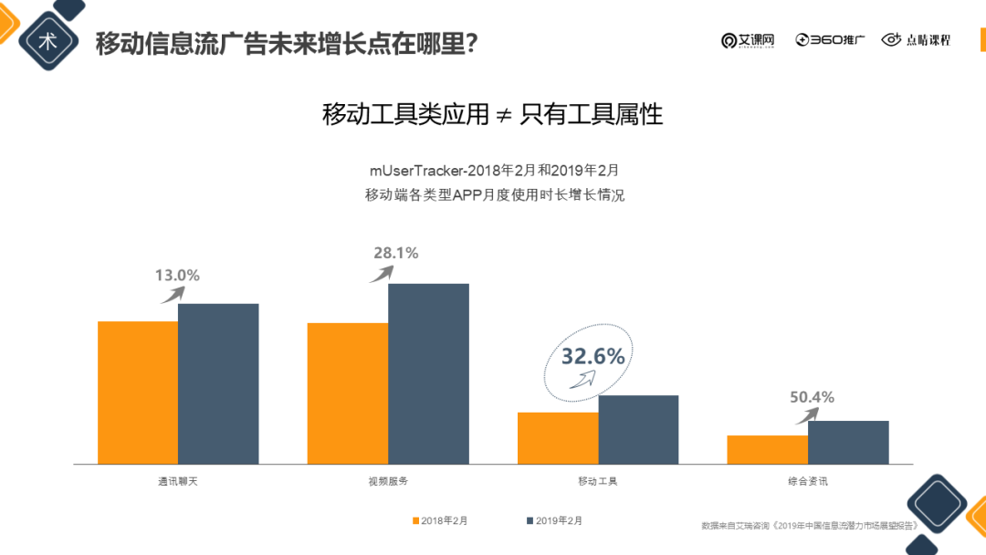 移动工具类场景+PC场景人口红利消失,内容同质化,信息流广告未来的增长点在哪里?移动工具类应用的信息流体量可观王恒老师分享到用户在工具类应用的使用时长增长量超过了视频类和通讯聊天类,也就是说,工具类应用不只有工具属性,还同时具备阅读属性,如墨迹天气,不止可以看天气,还可以看新闻资讯,我们称之为工具信息流,浏览器、无线上网、天气、美食等垂直领域的工具信息流相当可观,是信息流广告未来新的机会点之一。