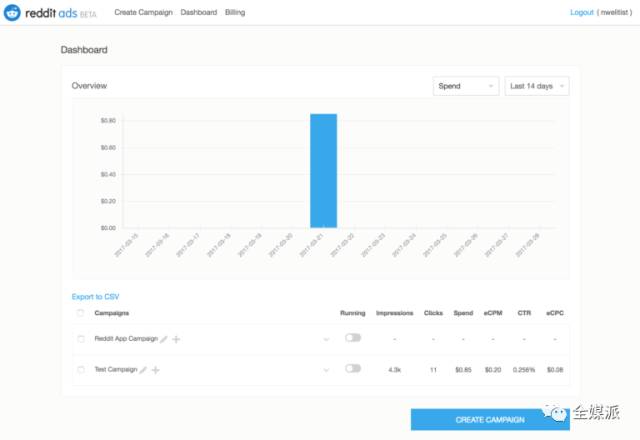Reddit新的数据仪表盘去年2月,Reddit曾推出一个实时竞价的广告投放系统,允许客户自主在Reddit上对广告的位置进行投标,同时将广告费的门槛大幅降低系列广告最低费用支出从20美元降低到5美元,最低每千次展示费用从1.50美元降低到0.2美元,并允许广告客户在使用较低预算时同时尝试多个版块投放,以寻找最佳效果。