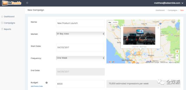 AdSemble:帮中小企业主“占领”广告牌当然,自主广告服务不仅仅局限在社交平台和线上,传统户外广告也开始支持自助投放服务例如,AdSemble就将自助广告的服务模式延伸至线下,使中小企业能自助购买全美各城市的大广告牌展示。