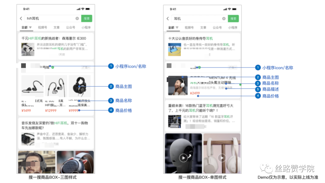 01产品介绍1.功能描述①搜索广告在【微信搜一搜】版位支持动态商品广告(dpa广告)。②用户在搜一搜搜索电商意图词,如下图的hifi耳机,展示商品广告特殊样式(商品box样式)。