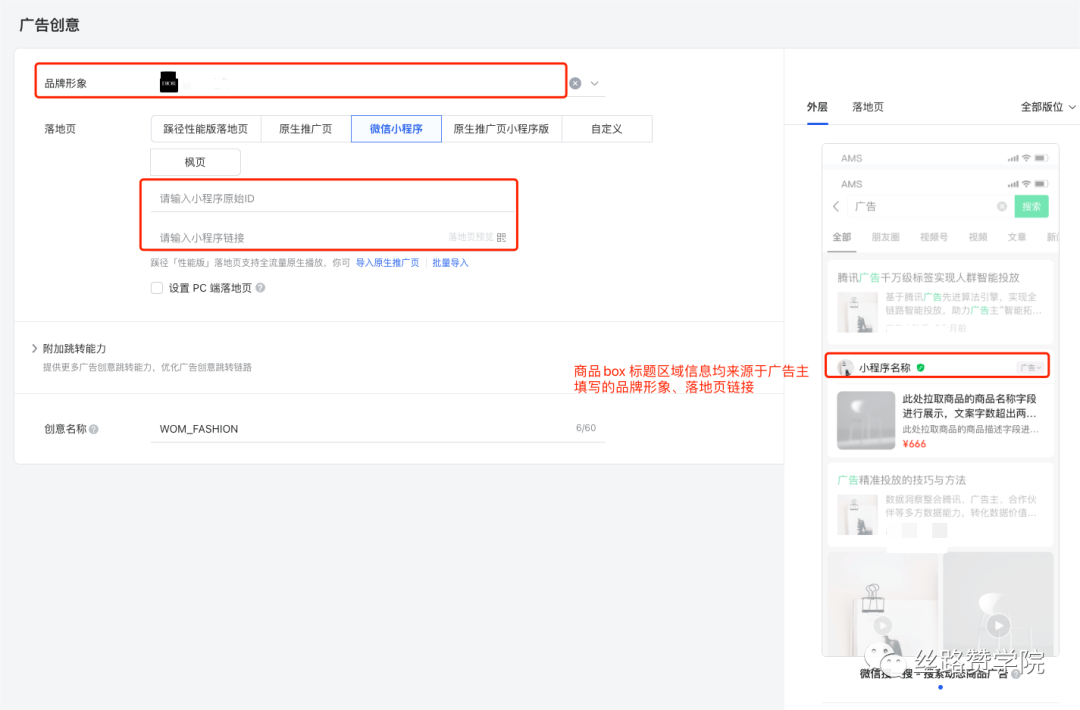 图片来源:腾讯广告后台截图注意:商品box样式标题区域的头像、昵称、跳转链接都是使用广告主填写的信息。