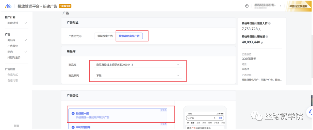 图片来源:腾讯广告后台截图②商品直投◆广告形式:选择“搜索动态商品广告”◆商品库:选择商品库和商品系列◆版位:选择微信搜一搜版位◆其他广告填写项:按需正常设置即可◆编辑广告时,不支持更改广告形式、商品库和商品系列。
