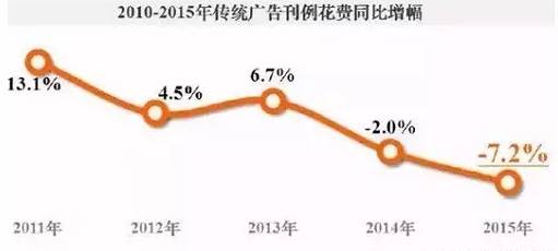 据央视市场研究(CTR)媒介智讯的最新数字显示,2015年中国整体广告市场下跌了2.9%主要下跌板块为传统媒体,全年损失了创纪录的7.2%各传统媒体中,失血最严重的是报纸,与一年之前相比滑坡了35.4%;紧随其后的是杂志,流失了19.8%。