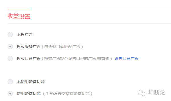 2、赞赏收入针对已开通“原创”功能的账号还可以使用“赞赏”功能,坤鹏论需要提醒一下大家,该功能默认是不开放通,作者可以自己在后台“收益设置”里开通。