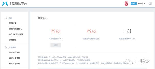 当然了,前提都得开通原创企鹅自媒体开放平台广告也是CPM形式的,据坤鹏论的计算,每千次展示的收入应该比今日头条多,只可惜平台文章阅读量低,所以整体收入也就没多少。