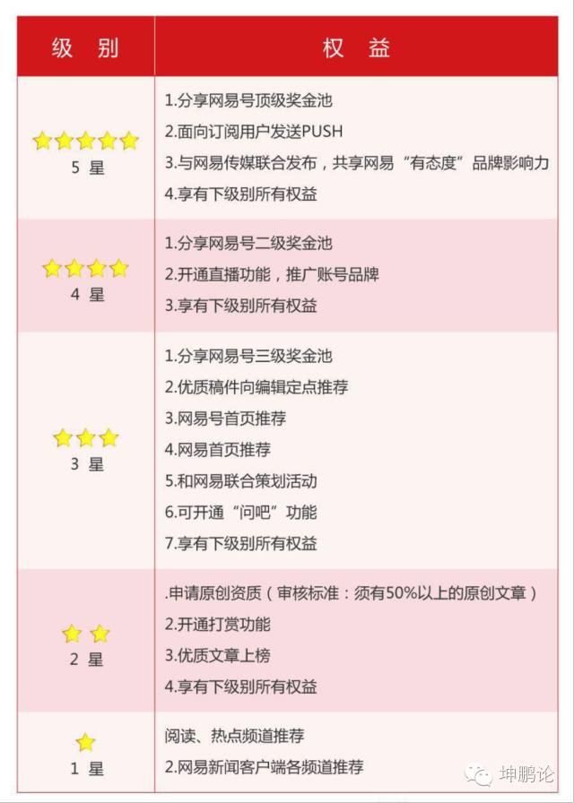三网易号媒体开放平台网易号媒体开放平台也开通广告分成功能,也有原创功能和打赏功能。网易号媒体开放平台将作者分为五个等级,针对不同等级有不同的权限。