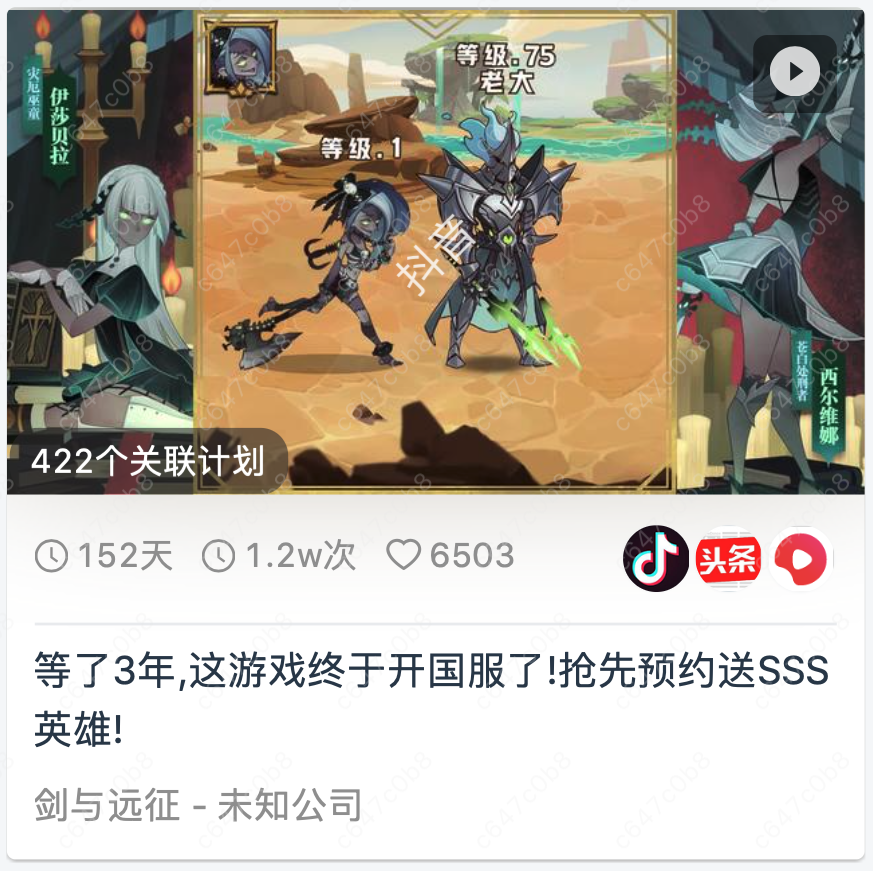 有的产品还会把预约投放的周期拉得更长,例如《剑与远征》它的全平台上线时间是1月8日,但在2019年10月它就开始主要在巨量引擎上投放预约素材,素材形式以游戏玩法视频介绍为主据知情人士称,《剑与远征》仅在巨量引擎上的预约消耗就超过千万。