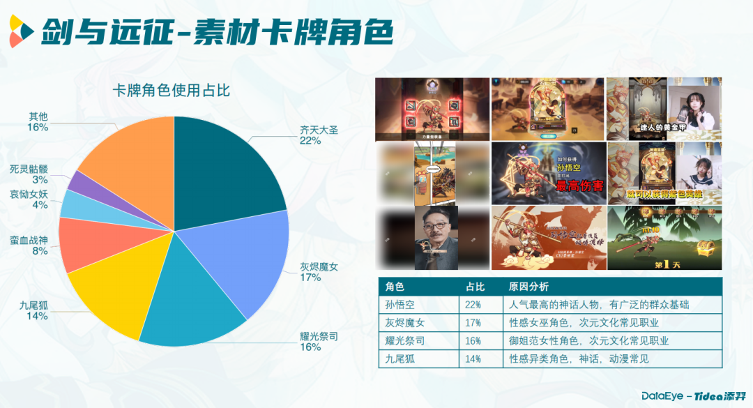 根据DataEye的统计,在这一阶段《剑与远征》有30%的素材都与卡牌展示有关。孙悟空、灰烬魔女、耀光祭祀和九尾狐是最经常被使用的角色。