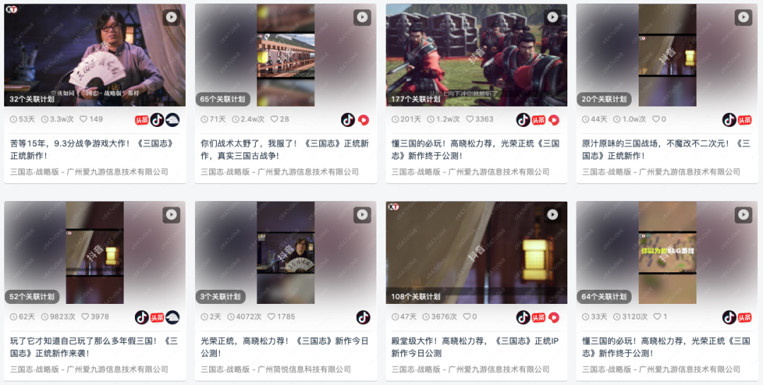 一则抖音上的内容《三国志:战略版》也是一款吃到爆量打法红利的产品。它的玩法基于《率土之滨》,数值模型经过验证,因此一上线就高举高打,吸引了不少用户。它的第一个爆量阶段大概持续了2-3个月。