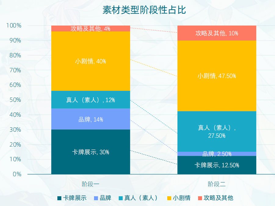 稳定投放:拉回流,拼长线最后,在爆量的投放高峰期结束后,一部分大预算的产品还会进入一个拉回流、拉付费、提升利润的阶段这个阶段可能会带来次一级的投放波峰例如《剑与远征》上线1个月后的素材类型就发生了变化建立用户认知的品牌广告和卡牌展示减少,真人拍摄广告和小剧情广告增加,且39%的真人视频广告都和主播有关,以吸引男性硬核玩家。