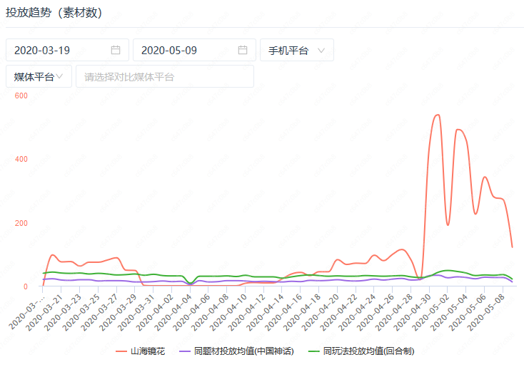 营销前置,拉长预约投放第一步,花钱要从产品还没上线的时候开始以4月29日上线的《山海镜花》为例,它曾分别在3月20日-3月29日,和4月20日-4月29日做了不少预约投放在爆量期间,「全网预约超400万」还成了它的素材关键词。