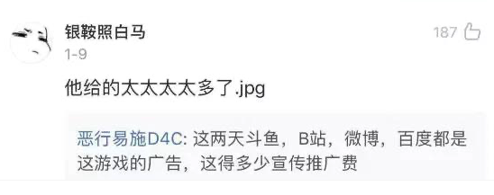 事实上,最近不少大厂的老产品都在加大投放的力度张子龙曾说,《剑与远征》首月营销和买量的预算比例大概在1:6到1:8之间而某大厂的市场人员曾告诉葡萄君,他们头部项目的营销预算一般是月流水的8%-10%考虑到老游戏很少会开展大规模的营销活动,如此推算,一款月流水1亿元的产品,一年的预算或接近1亿。