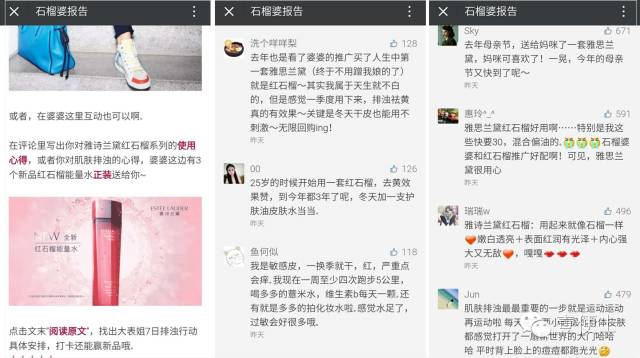 石榴婆报告为雅诗兰黛红石榴系列推送的软广,评论区大量粉丝针对雅诗兰黛的产品以及护肤等进行讨论,用户好评瞬间提升雅诗兰黛产品美誉度KOL在这里营造的就是一个对话场景,这种对话既是用户与KOL的对话,也是用户与品牌的对话。